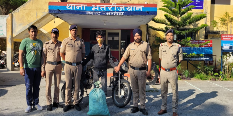 जनपद की थाना भतरौजखान पुलिस टीम ने मोटर साईकिल से गांजा तस्करी कर रहे युवक को गिरफ्तार किया है वहीं साथ के 02 युवक अंधेरे का फायदा उठाकर भाग गए। एसएसपी देवेन्द्र पींचा द्वारा जनपद की पुलिस टीमों को नशा तस्करों के विरुद्ध कड़ी कार्यवाही करने के सख्त निर्देश दिए गए हैं। इसी क्रम में गुरुवार तड़के थानाध्यक्ष भतरौजखान सुशील कुमार के नेतृत्व में भतरौजखान पुलिस टीम गश्त पर थी। भतरौंजखान क्षेत्र में निकट छोटी घट्टी तिराहा पर एक बिना नम्बर प्लेट मोटर साइकिल आती दिखायी दी। जिसे रुकने के इशारा किया तो पुलिस को आता देख मोटर साईकिल छोड़ कर चालक अंधेरे का फायदा उठाकर मौके से भाग गया। कुछ समय पश्चात दूसरी मोटरसाइकिल संख्या यूके06-एक्स-2281 पल्सर आयी जिसे रोका गया तो मोटरसाइकिल की पिछली सीट पर बैठा युवक अंधेरे का फायदा उठाकर भाग गया। पुलिस टीम ने मोटरसाइकिल चला रहे युवक को दबोच लिया। कब्जे से एक कट्टे में कुल 11.185 किलोग्राम गांजा बरामद होने पर गिरफ्तार कर थाना भतरौजखान में एनडीपीएस एक्ट के तहत एफआईआर पंजीकृत की गई। दोनों मोटरसाइकिलों को सीज किया गया। पूछताछ में आरोपी अमन आर्या (21 वर्ष) पुत्र लाल मणि निवासी चोरपानी कोतवाली रामनगर ने बताया कि पहले मोटर साइकिल से आया अर्जुन बिष्ट निवासी लखनपुर रामनगर है। वह रेकी करते हुए हमारे आगे चल रहा था और मेरे साथ बैठा दूसरा युवक रोहित निवासी सौराल मोहान भतरौजखान है। हम गांजा ईकू खेत से सोराल मोहान ले जा रहे थे जिसे रोहित अपने दोस्त को मुम्बई भेजने वाला था। पुलिस द्वारा फरार वांछित युवकों की खोज की जा रही है। बरामद गांजे की कीमत 3.35 लाख रुपये बताई गई है। यहाँ भतरौजखान पुलिस टीम में एसआई सुनील कुमार, हेड कांस्टेबल श्रवण सैनी, प्रकाश कुमार, नारायण सिंह, हरजिंदर सिंह शामिल रहे।