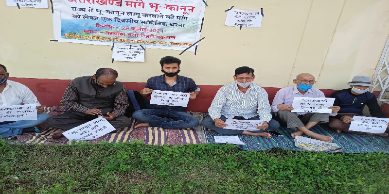 उत्तराखंड में सशक्त भू-कानून लागू करने की मांग को लेकर प्रगतिशील जन विकास संगठन ने गजा तहसील में सांकेतिक धरना दिया। धरना दे रहे लोगों को उत्तराखंड जन एकता पार्टी के केंद्रीय अध्यक्ष पूर्व केबिनेट मंत्री दिनेश धनै ने फोन कर समर्थन दिया। आंदोलनकारियों ने जन जन की यही पुकार, भू कानून लागू करें सरकार तथा उत्तराखंडी जागी जावा, एकजुट ह्वे जावा आदि नारों से प्रदेश में सशक्त भू-कानून लागू करने की मांग की। शुक्रवार को प्रगतिशील जन विकास संगठन गजा व सिविल सोसायटी नकोट के पदाधिकारियों ने पूर्व निर्धारित कार्यक्रम के अनुसार गजा तहसील में कोविड नियमों का पालन करते हुए सांकेतिक धरना देकर प्रदेश में सशक्त भू-कानून की मांग की। संगठन अध्यक्ष दिनेश प्रसाद उनियाल ने कहा कि सरकार को प्रदेश में भूमि बिक्री पर प्रतिबंध लगाना होगा। कहा कि अब तक जो भी सरकारें बनी हैं उनका ध्यान पृथक राज्य की मूल भावना से हट गया है। प्रदेश में मूल निवास प्रमाण पत्र लागू होना चाहिए था, लेकिन मूल निवास को समाप्त कर स्थाई निवास बना दिया। साथ ही यहां युवाओं को रोजगार भी नहीं मिल पाया है सिविल सोसायटी अध्यक्ष विक्रम सिंह रावत व अनिल भंडारी ने कहा कि पूर्वोत्तर राज्यों की तरह उत्तराखंड में भी सशक्त भू क़ानून लागू होना चाहिए था। बेहिसाब भूमि खरीदने से यहां की अस्मिता, सामाजिक समरसता भी खतरे में आ रही है। हमारे रीति-रिवाजों व धार्मिक भावनाएं भी प्रभावित हो रही हैं। कहा कि धीरे-धीरे दूसरे प्रदेशों के लोगों के सैकड़ो एकड़ जमीन खरीदने पर हम भूमिहीन हो जायेंगे। धरना दे रहे लोगों ने तहसीलदार गजा रेनु सैनी के माध्यम से मुख्यमंत्री को ज्ञापन प्रेषित किया। धरना प्रदर्शन में सेवानिवृत्त सूबेदार मनजीत सिंह नेगी, टंखी सिंह नेगी, राजवीर सिंह चौहान, अनिल भंडारी, वासुदेव उनियाल, चतर सिंह नेगी, मनजीत सिंह नेगी, दिलवीर सिंह रावत, सूर्य रावत, एलएस राणा, सुरजीत सिंह आदि मौजूद रहे।