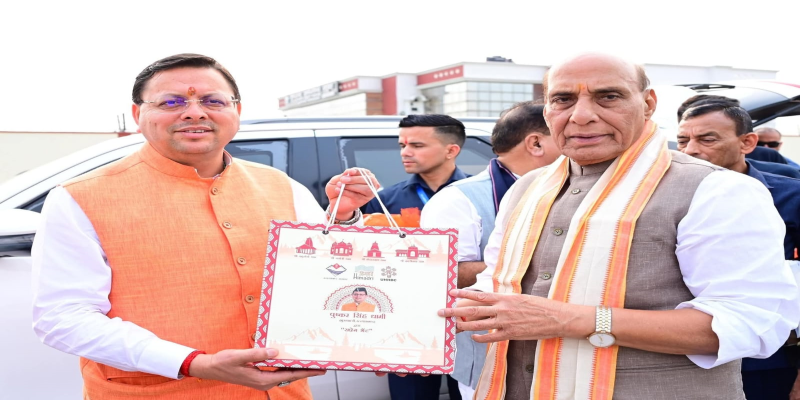 सीएम धामी ने किया केंद्रीय रक्षा मंत्री राजनाथ सिंह के देवभूमि उत्तराखण्ड से प्रस्थान पर उन्हें चारों धामों का प्रसाद भेंट