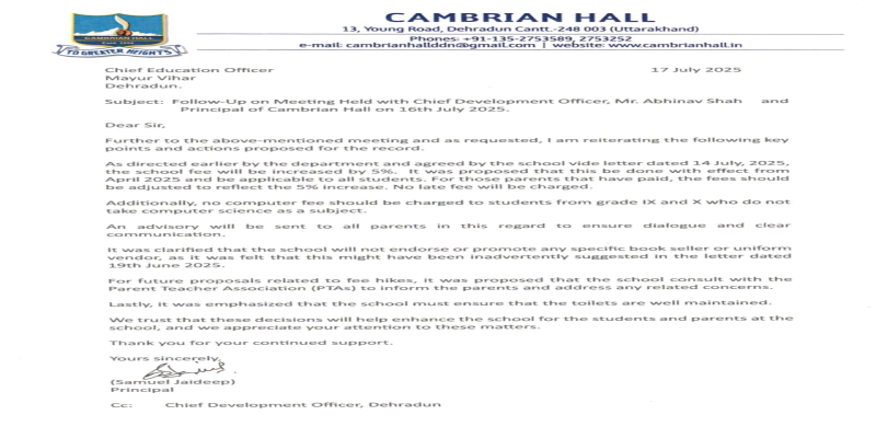 मुख्यमंत्री के निर्देश और जिला प्रशासन के आक्रामक रवैये से कैंब्रियन हॉल स्कूल अब बैकफुट पर आ गया है। स्कूल ने मनमाने तरीके से 10 प्रतिशत फीस वृद्वि को 05 प्रतिशत कम कर दिया है। जिलाधिकारी सविन बंसल के निर्देशों पर नियमों का पालन न करने वाले स्कूलों के खिलाफ कडा एक्शन लिया जा रहा है। जिला प्रशासन द्वारा स्कूल पर सख्त प्रवर्तन एक्शन के बाद अभिभावकों को बड़ी राहत मिली है। ‘भय बिनु होई न प्रीति‘ कहावत को चरितार्थ करता जिला प्रशासनय नामी गिरामी निजी स्कूलों पर शिकंजा, दसियों व्यथित अभिभावक झंुड ने जब लगाई डीएम से गुहार, बस तभी से कार्यवाही का सिलसिला शुरू हो गया है। अब निजी नामी कैब्रियन स्कूल पर प्रशासन ने शिंकजा कस दिया है। मा0 सीएम की डीएम को सख्त हिदायत है कि शिक्षा का मंदिर नहीं बनेगा व्यवसाय का अड्डा, जिला प्रशासन ने स्कूल संचालकों के पेंच कस दिए है। तमीज, आग्रह, उदबोधन से नही आए बाजय तो जनहित लागू करवाना प्रशासन जानता है। मई में स्कूलों को जारी आदेश की अवहेलना, शिकायत पर डीएम का सख्त प्रवर्तन एक्शन, स्कूल से ही 5 प्रतिशत् पर खिंचवाई फीस की लकीर। जिले के नामी गिरामी स्कूल को करनी पड़ी फीस कम, अभिभावकों से अब तक वसूली गई अधिक फीस अब आगे घटाते हुए समायोजित करेगें दी लिखित अण्डरटेकिंग दी है। मा0 सीएम के निर्देश, शिकायत पर जिला प्रशासन ने विगत मई में ही कई निजी स्कूलों की कुंडली खंगाली है। जिला प्रशासन का एक्शन, स्कूल को जारी करनी पड़ा कही से भी खरीदें किताबें और ड्रेस का पत्र। स्कूल पर जिला प्रशासन का सख्त प्रवर्तन एक्शन से अभिभावकों को बड़ी राहत मिल गई है। जिलाधिकारी ने स्पष्ट किया कि शिक्षा सबका अधिकार, अभिभावकों और बच्चों का शोषण बर्दाश्त नहीं किया जाएगा शिकायत मिली तो मान्यता निरस्त करने की कार्यवाही की जाएगी। दरअसल, जिलाधिकारी की अध्यक्षता में 14 जुलाई को आयोजित जनता दरबार में मोनिका राणा एवं अन्य अभिभावकों ने शिकायत दर्ज की थी कि जिला प्रशासन के प्रतिबंधों के बावजूद भी कैम्ब्रियन स्कूल द्वारा फीस कम नही की गई है। स्कूल प्रशासन द्वारा मनमाने ढंग से फीस बढ़ाई गई है। जिससे अभिभावकों को अपने बच्चों की पढाई के लिए आर्थिक कठिनाइयों का सामना करना पड रहा है। जिलाधिकारी सविन बंसल ने अभिभावकों की शिकायत को गंभीरता से लेते हुए मुख्य विकास अधिकारी अभिनव शाह की अध्यक्षता में गठित जिला प्रशासन की कोर टीम को प्रकरण की जांच करने और कैम्ब्रियन स्कूल की सीबीएससी संबद्वता हेतु राज्य सरकार द्वारा निर्गत एनओसी रद्व करते हुए स्कूल के खिलाफ सख्त प्रवर्तन एक्शन लेने के निर्देश दिए गए। इस पर मुख्य विकास अधिकारी एवं मुख्य शिक्षा अधिकारी ने कैम्ब्रियन स्कूल को नोटिस जारी करते हुए स्कूल प