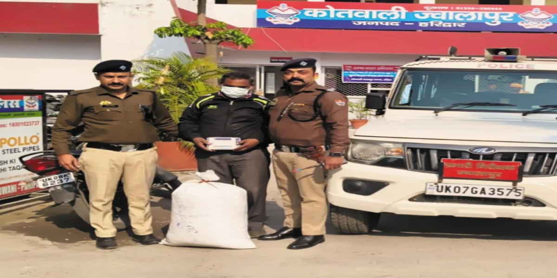 ज्वालापुर पुलिस ने 21.7 किलो गांजा के साथ एक आरोपी को गिरफ्तार किया है। कोतवाली प्रभारी कुंदन सिंह राणा ने बताया कि एसआई रविंद्र जोशी टीम के साथ गश्त कर रहे थे। इसी दौरान लालपुल अंडरपास के पास एक युवक पुलिस को देखकर भागने लगा। उसका पीछा कर कट्टे की तलाशी ली तो अवैध गांजा भरा मिला। युवक ने अपना नाम जगदीश, निवासी आदर्श कॉलोनी फकीरपुरा, मुरादाबाद बताया।