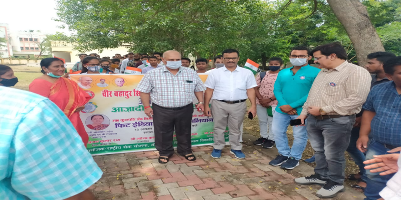 पूर्वांचल विश्वविद्यालय में आजादी के अमृत महोत्सव के उपलक्ष्य में राष्ट्रीय सेवा योजना के द्वारा मुक्तांगन परिसर में फिट इंडिया फ्रीडम रन अभियान की शुरुआत कुलपति प्रो. निर्मला एस. मौर्य ने किया।अपने उद्बोधन में कुलपति ने स्वयंसेवकों से कहा कि आजादी के 75वें वर्ष में आयोजित होने वाले अमृत महोत्सव को जन-जन तक पहुंचाएं तथा स्वस्थ रहने के लिए माननीय प्रधानमंत्री जी के मंत्र श्फिटनेस की डोज, आधा घंटा रोजश् का पालन करें। इस अभियान में राष्ट्रीय सेवा योजना के 75 स्वयंसेवकों ने तिरंगा लेकर 1 किलोमीटर की फिट इंडिया फ्रीडम दौड़ पूरी की। इस अवसर पर कार्यक्रम समन्वयक डॉ.राकेश कुमार यादव, डॉ. मनोज मिश्र, डॉ.गिरिधर मिश्र,वित्त अधिकारी संजय कुमार राय, कुलसचिव महेन्द्र कुमार, परीक्षा नियंत्रक वी. एन. सिंह, चीफ प्राक्टर डॉ. संतोष कुमार,समन्वयक मिशन शक्ति डॉ. जाह्नवी श्रीवास्तव, उप कुलसचिव वी. के. मौर्य, सहायक कुलसचिव अमृत लाल, दीपक सिंह एवं बबिता सिंह, निजी सहायक कुलपति डॉ. लक्ष्मी प्रसाद मौर्य, प्रीती यादव, स्नेहा मिश्रा, सुमित सिंह,दीपक पांडेय, अवनीश कुमार, सुभम सिंह, आकांक्षा सिंह, मृदुला सिंह, पंकज सिंह, संजीव कुमार, सत्या गुप्ता आदि उपस्थित रहे।