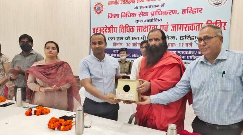 हरिद्वार। एस.एस.एम.जे.एन. कॉलेज में राज्य विधिक सेवा प्राधिकरण, उच्च न्यायालय नैनीताल के निर्देशानुसार निःशुल्क विधिक सहायता के समुचित प्रचार-प्रसार हेतु विधिक साक्षरता एवं जागरुकता शिविर का आयोजन किया गया। अखिल भारतीय अखाड़ा परिषद एवं कॉलेज प्रबन्ध समिति के अध्यक्ष श्रीमहन्त रविन्द्रपुरी महाराज, मुख्य अतिथि सिविल जज अभय कुमार सिंह, कालेज के प्राचार्य डा.सुनील कुमार बत्रा, रश्मि पन्त, शालिनी बड़ोनी ने सरस्वती वंदना तथा द्वीप प्रज्जवलित कर शिविर का शुभारंभ किया।